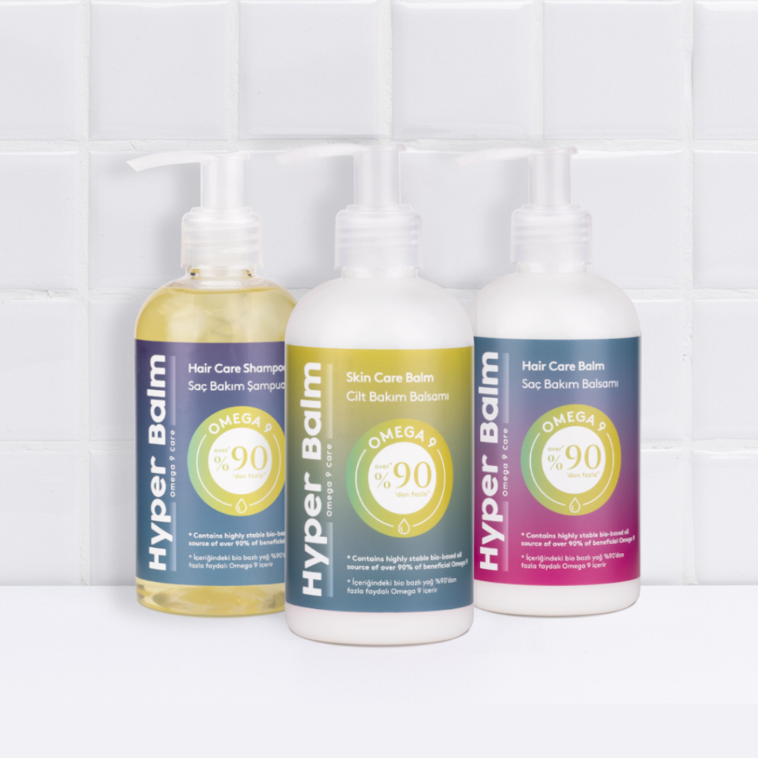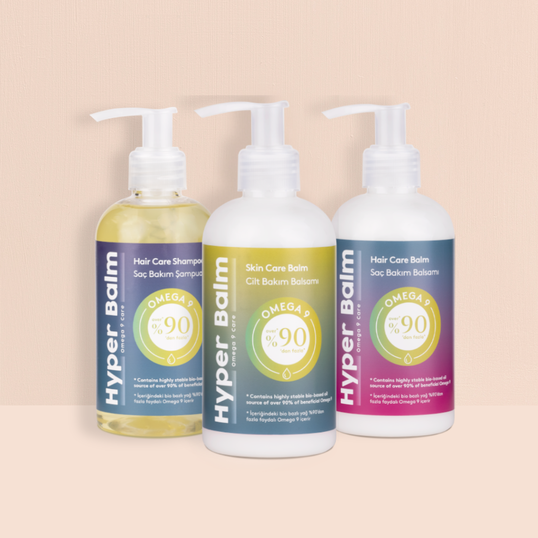 Hyper Balm Silikonsuz Saç Bakım Şampuanı, Hyper Balm Saç Bakım Balsamı ve Hyper Balm Cilt Bakım Balsamı'ndan oluşan 3’lü fırsat paketi, %90 oranında Omega 9 içeren bio bazlı yağ sayesinde, saçındaki ve cildindeki nem dengesini korur, saç derisi ve cildin onarımını destekler.