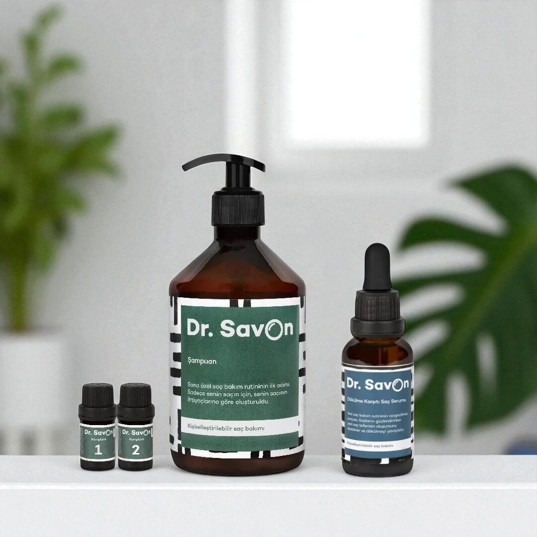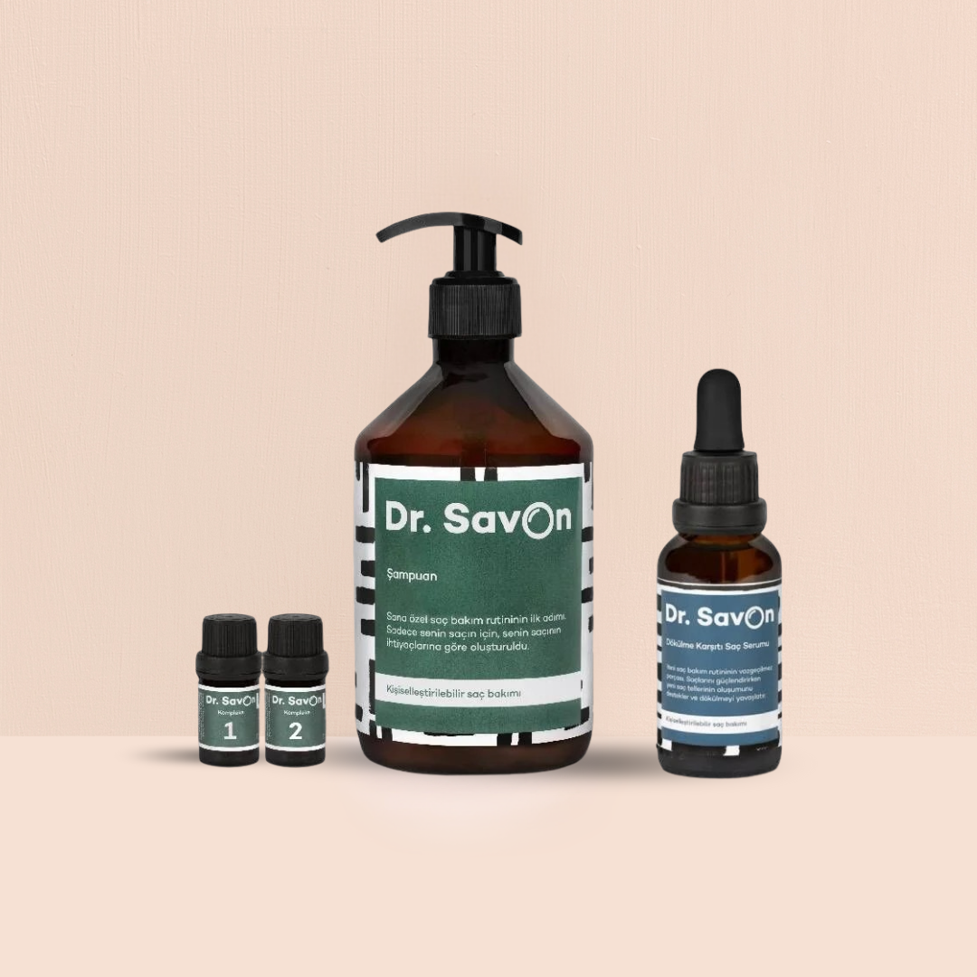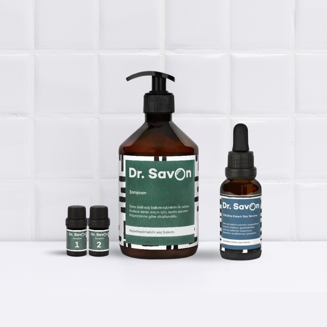 Dr. Savon Mavi Paket, şampuan bazı (400 ml), saçının özelliklerine ve hedeflerine göre seçeceğin 5 adet kompleks ile dökülme karşıtı saç serumu (30 ml) içerir.
